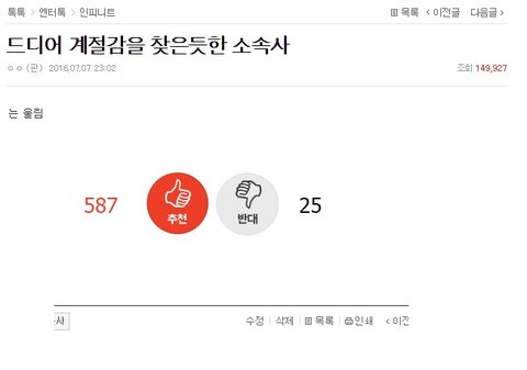 끝에쯤에 어그로들이 몰려와서 순위얘기랑 얼굴이 못생겼다느니 지껄이길레 댓글로