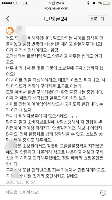 흔한 판녀인데 바퀴벌레 톡선 보고 이 쇼핑몰 궁금해져서 네이버에 쳤어. 그런데 불로그 후기가 뜨길래 들어가봤더니 댓글들이 가관이더라.. 2014년도 부터 2016년 까지 쇼핑몰은 후기 나쁘게 쓰면 자기들이 지워버리니까 저렇게 블로그에 답답함 호소했네.. 원래 이런 문제 있었었나봐 ㅇㅇ 사실 더 많던데 캡쳐하고 이름 모자이크 하기 귀찮아. 네이버에 쇼핑몰치고 블로그 포스팅된거 보면 쉽게 찾을수있는 댓글들이야!