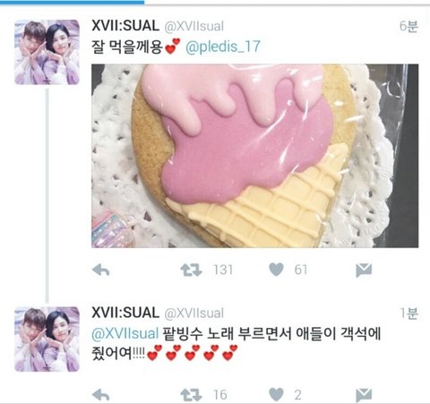 위 트윗들 안에 있는 쿠키 사진은 세븐틴이 스케치북에서 '팥빙수'를 부를 때 관객분들께 나누어드린 쿠키입니다. 즉, 저기 있는 저 홈마들은 스케치북에 가서 공연을 관람했다는 말이 됩니다.