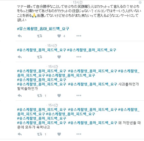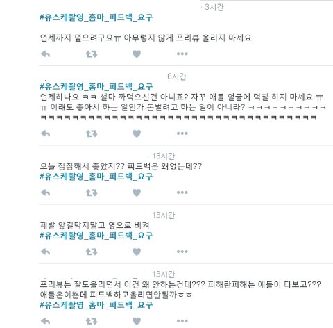 지금 다수의 캐럿들은 트위터에서 '#유스케촬영_홈마_피드백_요구' 로 논란의 중심인 홈마들에게 피드백을 끊임 없이 요구하고 있는 상황입니다.