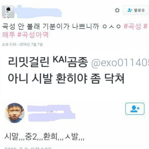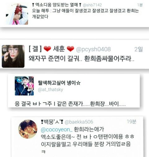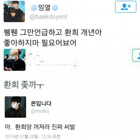 미친 거 아니냐 진짜ㅋㅋㅋㅋㅋㅋㅋㅋㅋㅋㅋ 겨우 열다섯이 방탄 좋다고 했다고 저렇게 까여야 되냐 정작 방송과는 무관한 인신공격들이랑 패드립들이 난무하는데 이걸 과연 어떻게 받아들일까 애가 좀 심한 것 같지 않나 내 가수도 중요하지만 환희도 누군가의 소중한 사람일 텐게 저렇게 깎아내려도 되는 건지