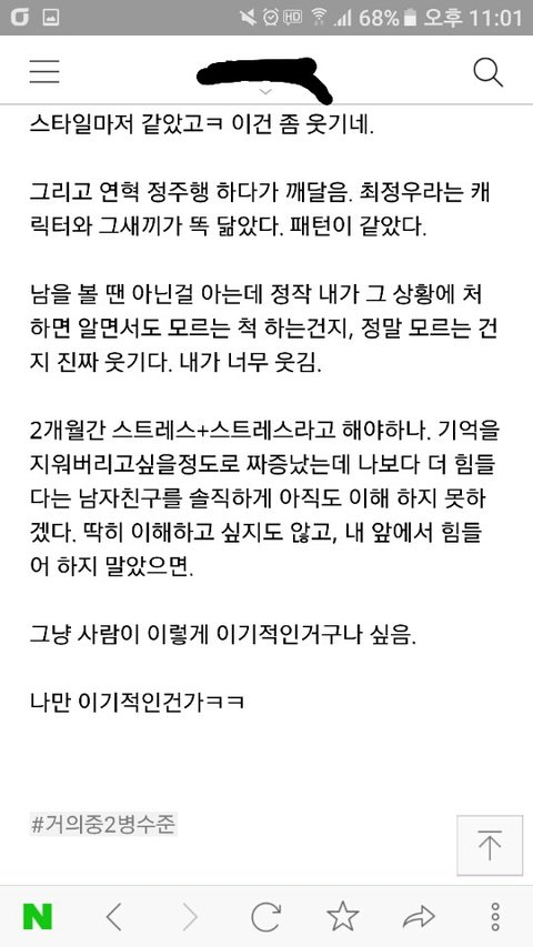 그래서 여자친구는 제가 치유해줬지만... 치유받지 못해서 정신적으로 고통받고있습니다.없었던 의심병이 생기고 의처증 비슷한 증세도 생긴거 같습니다.여자친구의 핸드폰을 자주 들여다 보게됩니다.