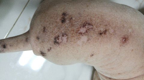 자궁충농증이 심해서 병원에서 수술하고 한달정도 지났는데, 강아지 몸 전체에 아래 사진처럼 거멓게 피부병이 번지고 있어요..