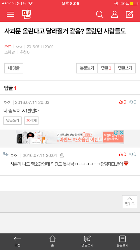 ㅋㅋㅋㅋㅋ 엑소 팬? 지랄하네 니가 진짜 엑소 팬이면 손가락 놀리지마 __아