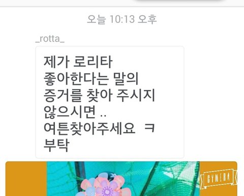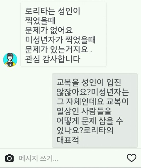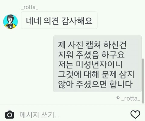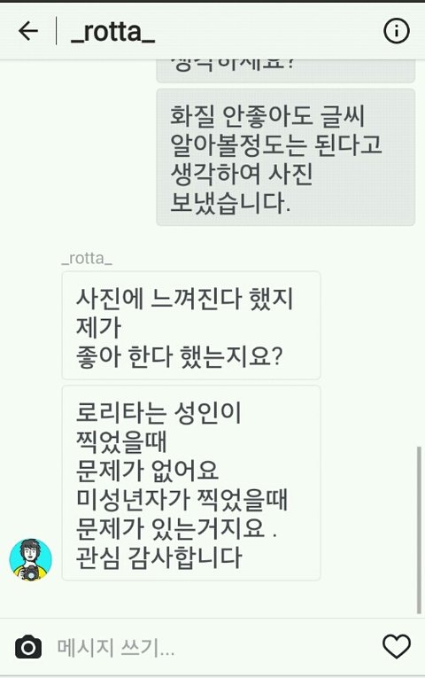 지금 진짜 어이없고 황당하다 ㅋㅋㅋㅋ몇주전에 내가 로타인스타에서 말도 안되는 댓글이 많이 보이길래 댓글 한두개 달고 왔는데 오늘 씻고 폰 켜니까 로타한테 다이렉트 와있더라 나는 잘못본줄알았어 ㅋㅋㅋㅋ첫짤은 내가 내 인스타에 올린 사진이고 그걸 로타가 캡쳐해서 나한테 이사진도 자기가 올리면 로리타라고 할꺼다 라는 식으로 말한거야 나는 미성년자고..ㅋㅋㅋㅋㅋ평소에 좋아하지 않았는데 저런 내용으로 다이렉트 받으니까 진짜 어이없고 ㅋㅋㅋㅋㅋ솔직히 톡선가서 퍼트려졌으면 좋겠다..ㅋㅋㅋㅋㅋ두서없는 긴글 읽어줘서 고마워