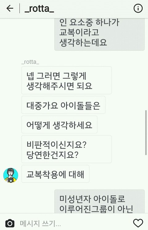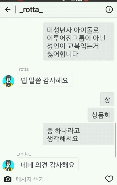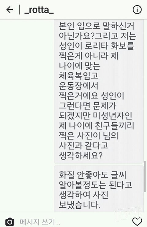 ㅇㅇ 글에 다써져있음 글쓴이가 로타인스타에 로타사진을 로리타라고 비판하는 댓글을 담-로타가 다이렉트옴-글쓴이랑 대화함-로타가 글쓴이가 체육복입은사진을 글쓴이 인스타에서 캡처해서 그런식으로 말함-글쓴이는 자기가 미성년자고 그에 걸맞은 학교체육복을 입은게 뭐가문제?라고 반박함-로타 네네감사해요 드립
