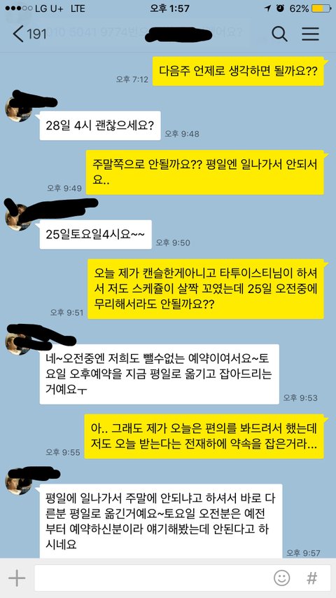 맞다고했습니다 왜냐면 타투이스트가 예약캔슬은 총3번이나 했거든요 첫번째는 제가 처음시술받는날 아프다고 캔슬 두번째는 한달전인 토요일에 갑작스러운 잠수 그리고 마지막은 그냥 이유를 말하지도 않고 자기가 캔슬을 내더군요