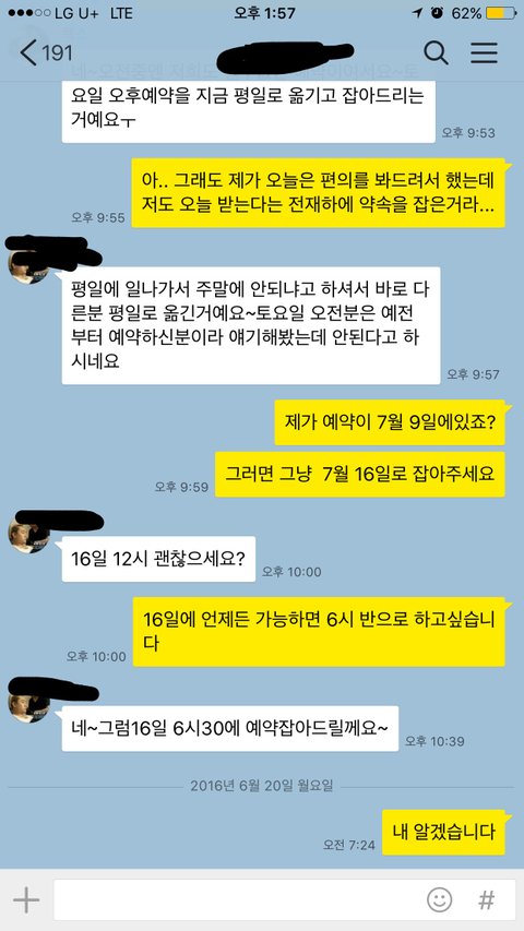 사진은 제가 예약했을때 보낸 카톡입니다 전 아무리봐도 그런 취급받을 만한 언행은 하지않은거 같은데..