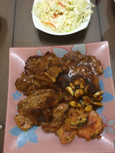 이건 돼지등심 스테이크예요~스테이크소스 샐러드 소스 수제로 만들어서 먹음 나름 건강하게 먹는 기분이예요~