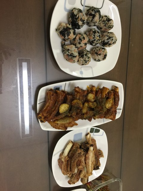 소금구이 양념구이 등갈비해서 참치주먹밥과 같이 먹었어요~양념구이는 후라이팬에 해서 맛난데 소금구이는 오븐에서 육포가 됐어요;; 전 기계랑 정말 안친해요 ㅠㅠ 더워도 불앞에서 해야하나봐요 ㅠㅠ