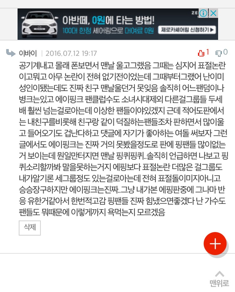 결국 그후로 난 판 어플도지우고 팬들사이에서 가끔 판얘기가 나오면 거긴 갈곳이 못된다고 다들 애써 웃어넘기고 아예 판을 잊고살고있었어