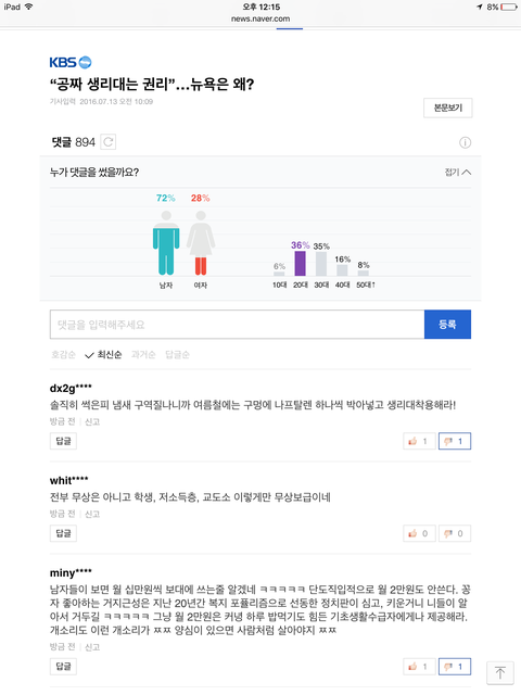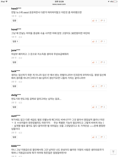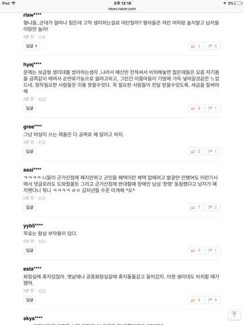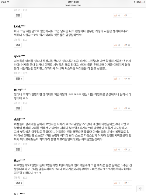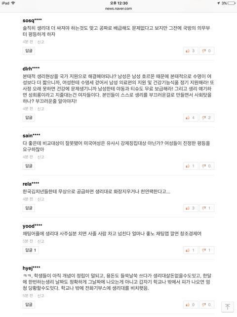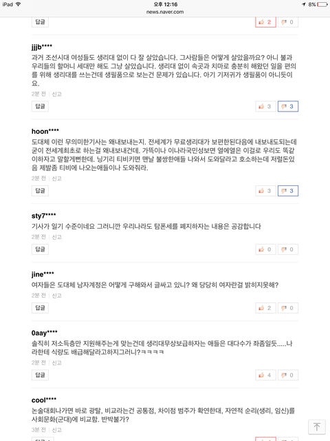 방금 네이버 뉴스보다가 많이 본 뉴스에 생리대 무상지급이 1위라서 들어 가봤는데 댓글 수가 어마나 하더라구요...
