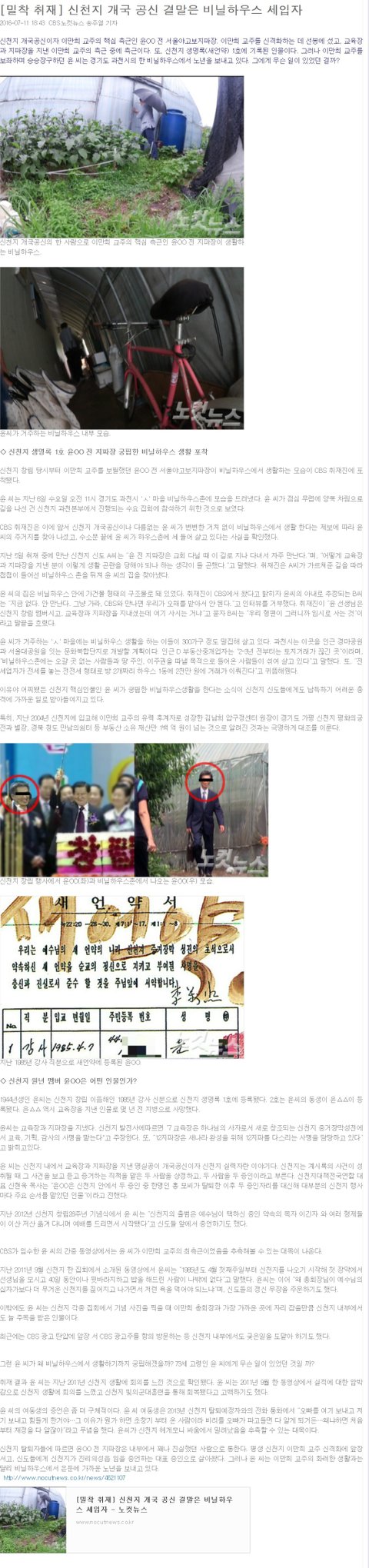 CBS 취재진은 이에 앞서 신천지 개국공신이나 다름없는 윤 씨가 변변한 거처 없이 비닐하우스에서 생활 한다는 제보에 따라 윤 씨의 주거지를 찾아 나섰고, 수소문 끝에 윤 씨가 하우스촌에 세 들어 살고 있다는 사실을 확인했다.