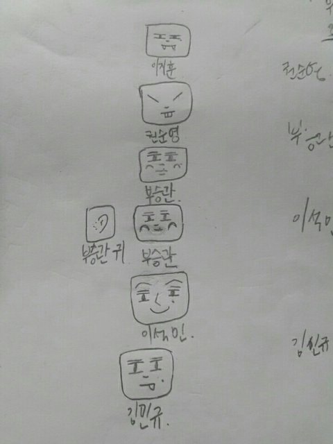 일단 이건 그린거야 음.. 내가 그림을 진짜 못 그려서 하나도 안 똑같을 수도 있어...ㅋㅋㅋㅋ 걍 얼굴이지만 눈코입...ㅎ 근데 코 때문에 석민이 빼고 다 고양이나 강아지 같이 보인닼ㅋㅋㅋ 그리고 승관이는 귀에 점이 인상 깊어서 귀도 그리고 승관이를 첨에 그렸는데 약간 정색하는게 좀 이상해서 또 그렸어 근데 그리고 수정하고 또 그리고 수정하고 그래가지고 처음보다 되게 이상하게 되가지고 후회중이야..