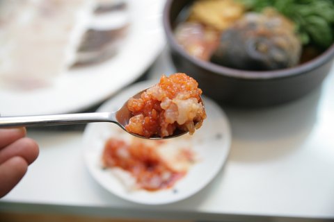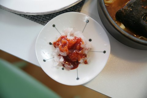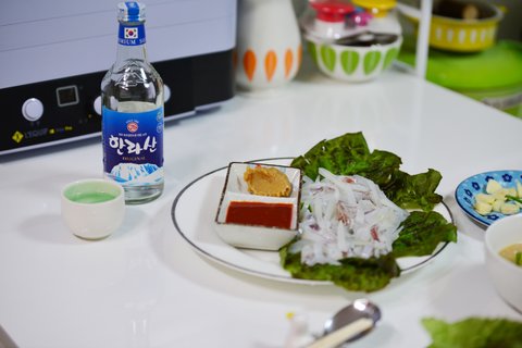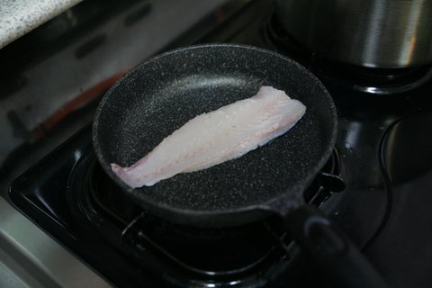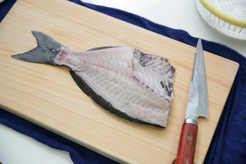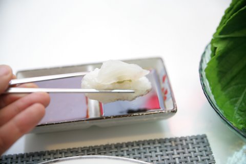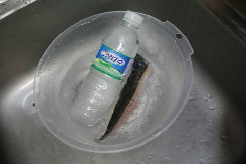벵에돔유비끼는 팬 불에 달군후 껍질부분 손으로 적당히 눌러준뒤 얼음물에 넣어주면됩니다.