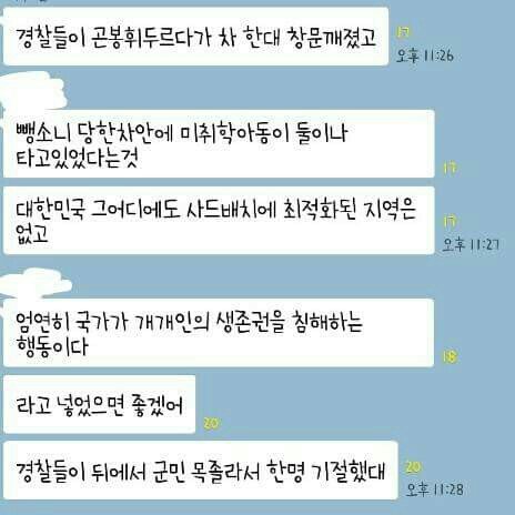 7월 15일인 오늘 황교안 국무총리 님께서 성주를 방문하셨습니다. 성주에 있는 학생들도 오전부터 군청에 모여 앉아있었고요. 그런데 그저 죄송하다는 말만 연신 반복하셨습니다. 저희는 죄송하다는 말 보다는 왜 군민들의 동의 없이 정부 멋대로 사드 설치를 결정하였는지, 왜 안전성이 보장되지 않은 사드가 안전하다고 말씀하시는지, 미국에서 사드는 1.5km 까지 통제 구역으로 삼는데 우리 정부는 100m 를 통제 구역으로 요구하는지 궁금했습니다. 저희 군민들의 반이 사드 배치 예정 장소 3km 안에 살고 있는데 말입니다. 군청도 그 안에 있고요. 그 외에도 궁금한 점이 많습니다. 군민들이 답답한 마음과 열분을 이기지 못하고 계란을 던지고 물통을 던졌습니다. 국무총리께서 우리 성주 군민들에게 '계란을 맞았다', '물통을 맞았다' 라는 기사가 인터넷에 쫙 깔렸습니다. 6시간 동안 버스에 감금되었다는 기사도 깔렸고요. 기자님들은 국무총리만 보이십니까? 그들은 최루탄을 던졌고요, 그 앞에 할머니가 계셨습니다. 마구잡이로 쏜 소화기로도 맞았습니다. 1500명의 동원 경찰 중간 중간에 사복으로 위장하여 섞인 경찰들에게 폭행을 당하며 치사를 입은 분들도 계시고요, 그 치사를 당하신 분들 중에는 저희 학부형들도 계셨습니다. 국무총리께서는 군청 안으로 들어가셨습니다. 자신들의 주장이 당당하다면 사드를 배치한다고 통보하였을 때 대처 방안도 같이 제시하셨을 겁니다. 그런데 현재 저희는 대처 방안에 들은 바가 없습니다.