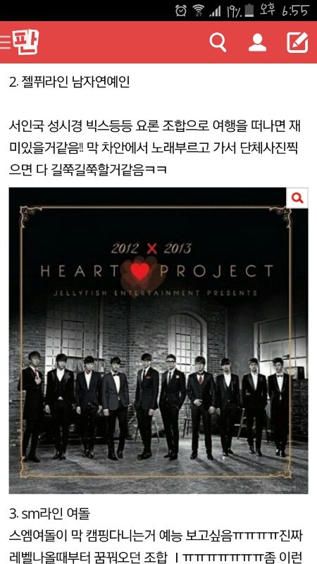 막 예능조합보다가 발견했는데 뭔가 재미있을거 같지않아? 같은소속사분들이랑 같이 차타고 여행다니면서 노래부르고...야시장같은곳에 돌아다니면 아이고 청년들 길쭉길쭉하구먼!!!