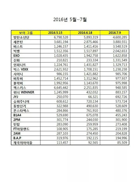 다른건 모르겠고 일단 빅뱅이랑 엑소가 저밑에 내려가있는거 부터 자체가 이미 신뢰도 왕창깨진걸로