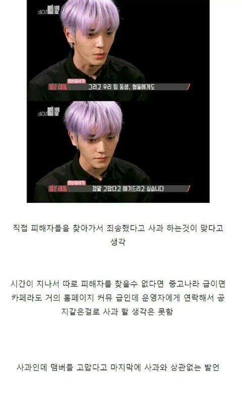 앞으로 제가 어떻게 할지도 많이 고민이 되고 음.............. 제가 데뷔 전에.... 이렇게.....................................데뷔 전에 이렇게......................어렸을 때....................굉장히 후회가 되고 창피한 그런....... 그런...............일들이 굉장히 많이 생각이 났어요. 지금까지도 그 생각밖에 안 나는 것 같아요. 머릿속에.....머릿속에 그 생각만 항상 가득차 있어요. 이렇게............사실은 정말...............진작에 했어야 하는 얘기지만.................제가 정말 철이 없고.............. 철이 없..........철이 없고 생각이 없고..............남을 이해하려는 마음이 없...없었을 때 저한테...........상처를 받으신 분들에게 진심으로 사과를 드리고 싶어요. 앞으로......앞으로...앞으로 제가 잘해야죠. 앞으로 제가 잘해야 저렇게 믿어주고 좋아해주는 동생들 앞에서도 더 당당하고 더 떳떳해지게 할 수 있을 것 같아서......... 그렇게 해야만 한다고 생각을 해요. ... 정말 저를 좋아해주기 힘드셨을텐데......이런 저를 좋아해주셔서 감사합니다. 그리고 우리 팀 동생, 형들에게도 이렇게 못난 저를 좋아해주고 믿어줘서 정말 고맙다고 얘기하고 싶습니다.ㅡㅡㅡㅡㅡㅡㅡㅡㅡㅡㅡㅡㅡㅡㅡㅡㅡㅡㅡㅡㅡㅡㅡㅡㅡㅡㅡㅡㅡㅡㅡ 태용 자신의 과거 언급과 사과 횟수는 5번이 넘습니다. 본인이 꾸준히 언급한다는 것은 본인도 그 일에 대해서 많이 반성하고있다고 생각합니다. 팬분들은 그냥 앞으로 태용이 어떻게 변하고 행동하는지 잘 지켜보는게 최선의 답일 것 같아요.