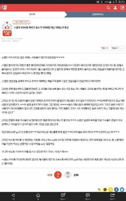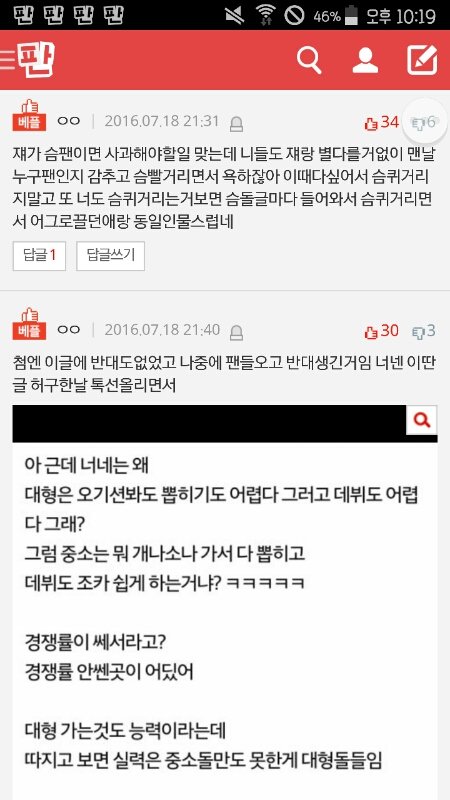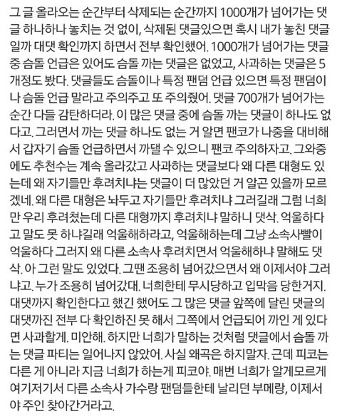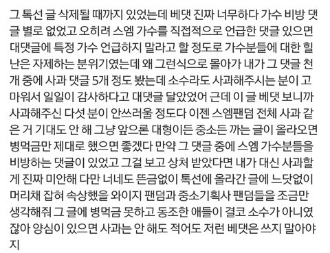 댓글에 중소돌 팬 와이지팬 아무도 슴가수 안 건들이고 추천수도 700개 넘어갔었는데 글쓴이는 사과도 안하고 다른 슴가수팬이 사과하는 댓글이 1000개 중에 10개 정도 였음.