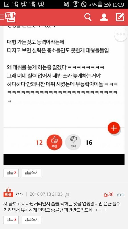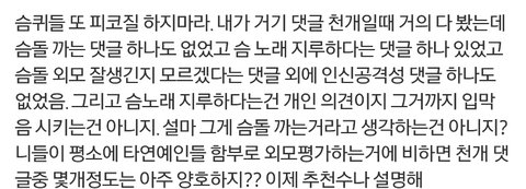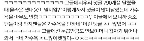 슴팬들은 글에 추천이랑 베댓에 추천만 박고 댓글은 쓰지 않음.