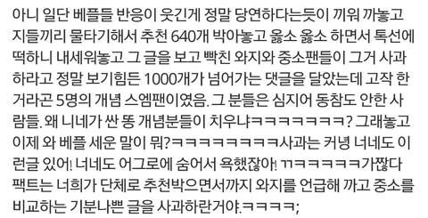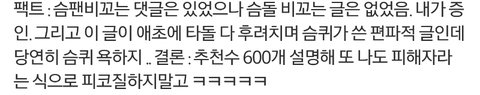 지금 이 글도 베댓부터 슴팬들이 쓴 댓글을 보면 사과할 생각이 없음. 적반하장 오진다.