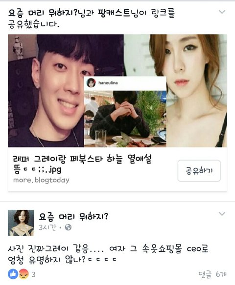 아니 삭제한건가?모르겠는데 지금그거 페북또불펌해가지고 페북으로알려지고 하늘인스타하고 그레이인스타까지 사귀냐고물어보고그러던데 확실한거아니면 그러지마셈 그레이도 아무감정없이 팔로우한건데 어색한사이에 팔로우한번했다고 그럼서로 얼마나뻘쭘하겟음 그리고 하늘인스타에 남자친구평범한 회사원이랬나 그글올렸다 지웠다는데 진짜 그레이나하늘이나 엮지말자 오늘학교에서도 어떤애가 둘이사귄다고 뭐라하던데 추측으로 썻던글로 페북이또 ㅈㄴ과장해서올리니깐그러는거아님 인스타에도 예쁘게사귀라고그런댓글도있고.. 그 하늘글캡쳐는못했지만 더이상 둘이엮지말자~결론은하늘은 일반인회사원남친있댔움