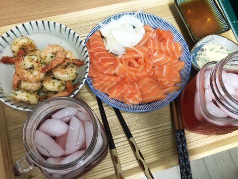 다이어트하려고 산 연어로 또 술상.. 쉬림프박스도 같이!