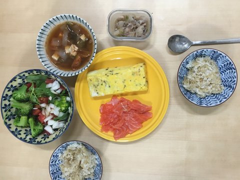 달걀말이와 된장국 토마토샐러드와 현미밥이에요.