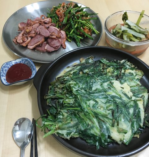 비오는날에는 이렇게 부추전에 훈제오리와 부추무침.
