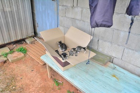 누군가 옆 폐가에서 길냥이의 밥을 주고 있음을 알고,이곳에 여섯 냥이들을 때를 맞춰 유기한 것으로 보였죠.