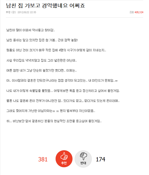 그동안 여친 집근처 까지는 가봤지만 집안에는 첨 들어가봤습니다. 집 앞 근처로 나오겠다는걸 아픈데 고생시키는것 같아 제가 우겨서 집까지 들어갔습니다. 근데 깜짝 놀랐습니다!!! 투룸은 아닌데 크기가 매우 작은 집에 5명의 식구가 어떻게 같이 지내는지.. 사실 저희집도 크게 부자는 아니고 집도 그냥 40평정도 됩니다. 아무튼 그날 여친네 집을 가본후로 단순히 제가 놀라기만 한줄 알았습니다. 근데 점점 아.. 이 여자와는 결혼은 안되겠구나라는 생각이 들어가고 있습니다. 제 생각과 마음가짐이 문제일까요? 저도 제가 이렇게 약한 남자고 속물일줄 몰랐습니다. 하지만 실제 결혼하게 되면 현실이라는데..이렇게 생각하는 제가 잘못된 걸까요? 물론 저도 결혼에 돈이 전부가 아니란걸 알고는 있고 돈이란게 있다가도 없고 없다가도 있는게 돈이긴 하지만 그래도 찢어지게 가난한 이 여자와는 왠지 지금부터 자신이 없어 집니다 막연한 욕과 비난보다는 앞서 결혼하신 분들의 현실적인 조언을 듣고싶어서 글 올려봅니다