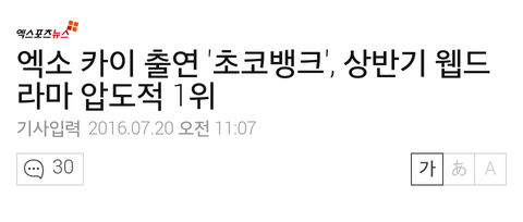 [엑스포츠뉴스 = 정지원 기자] 그룹 엑소 카이가 출연한 웹드라마 '초코뱅크'가 2016년 상반기 웹드라마 누적조회수 1위를 기록했다.