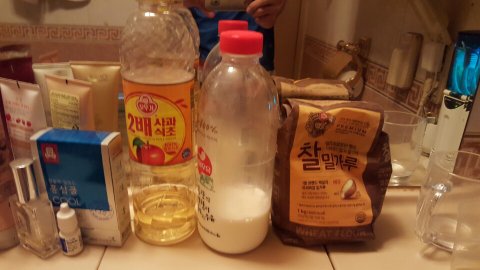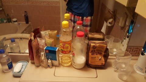 기본적으로 화장실 들어가면 식초, 우유, 밀가루, 홍삼이 있음
