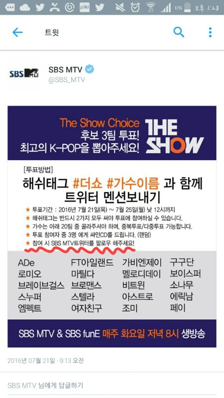 투표에서 지금까지 누가 앞서는지는 모르겠지만 ㅇㅍㅌㅇㅇㄹㄷ분들이 투표많이 하더라 이게 태그뒤에 댓글내용만 중복되지 않으면 7월25일까지 계~~~~~~속 투표가능해 가능한 엄청나게 도배하자..ㅎㅎㅎㅎ나는 계속 이모티콘+내용 이렇게 해서 중복안되게 하고있어 이번에 유력한 가수분들 많은데 우리가 꼭 여친 1위 시켜주자♡♡!!!!!!