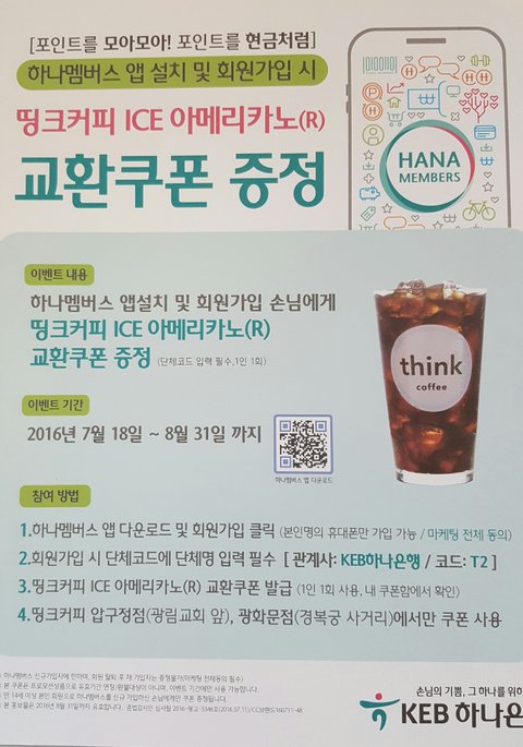 하나은행 거래시 포인트적립해드리는 어플리케이션 까시고 띵크커피 광화문점과 압구정점에서 사용하실수있는 쿠폰받아가세요~~
