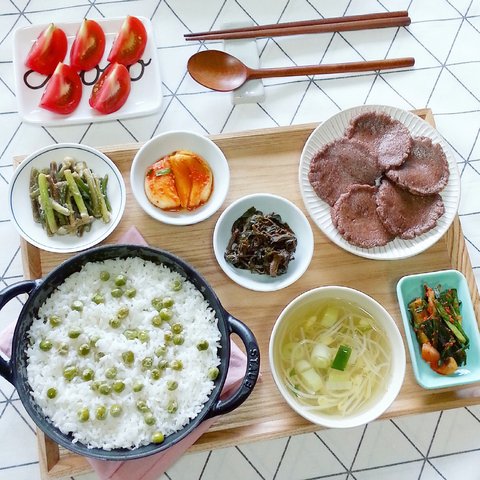 완두콩솥밥 / 콩나물국 / 들깨고무마순조림 / 양파김치 / 가죽나물무침 / 수수부꾸미 / 부추김치