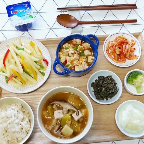 현미밥 / 파프리카감자볶음 / 마파두부 / 양파무침 / 뽕잎나물무침 / 브로콜리 / 양배추찜