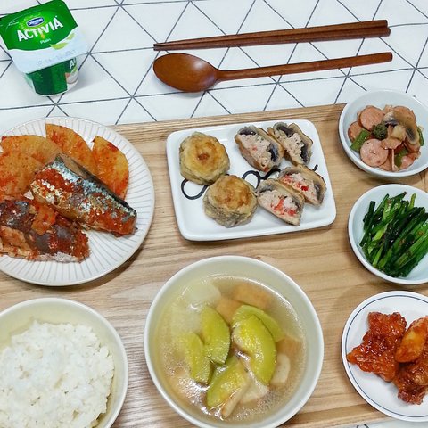 어묵국 / 고등어무조림 / 양송이버섯전 / 베어컨소시지볶음 / 부추무침 / 양념치킨