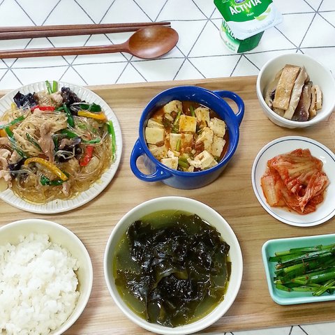 미역국 / 잡채 / 마파두부 / 어묵버섯볶음 / 배추김치 / 부추겉절이