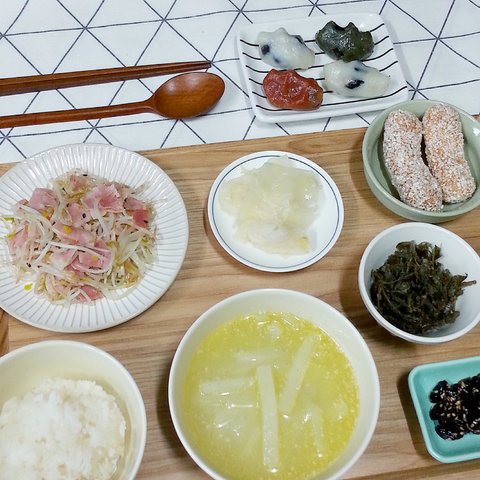 들깨무국 / 베어컨숙주볶음 / 양배추찜 / 뽕잎나물무침 / 콩자반 / 한과와 송편