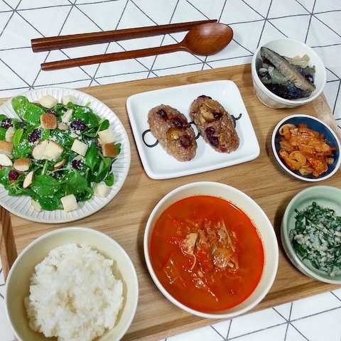 참치김치찌개 / 샐러드 / 버섯가지볶음 / 유부양파볶음 / 부추찜 / 약밥