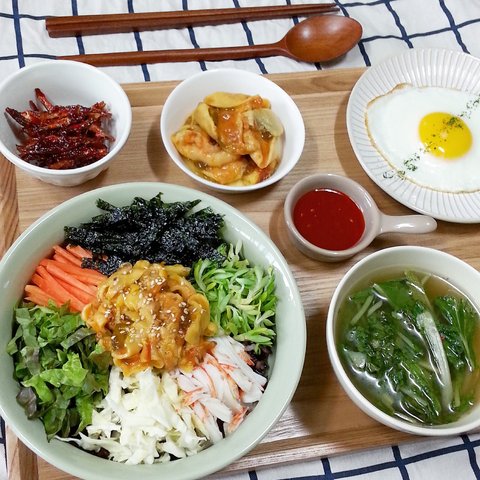 멍게비빔밥 / 물김치 / 고추장멸치볶음 / 멍게와 초고추장 / 계란후라이 / 콩자반