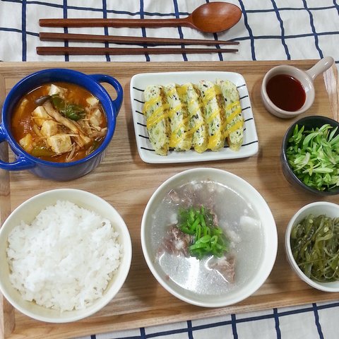 곰탕 / 마파두부 / 계란말이 / 돌나물과 초고추장 / 미역줄기볶음