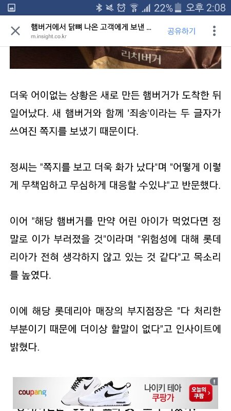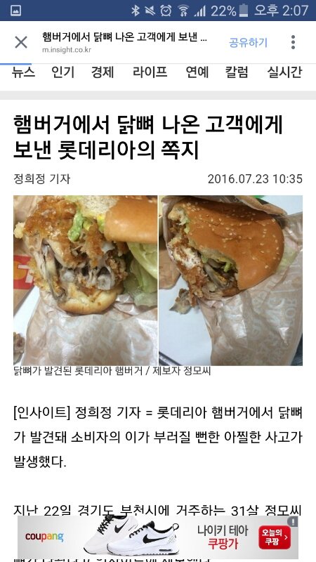페북보다가 기사에서 봤는데 닭뼈가 들어가서 문의를 했는데 햄버거랑 쪽지인가 쨋든 쪽지가 왔는데 죄송. 만 써있었음