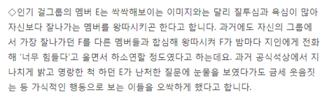 인기 걸그룹멤버 E, 알고보면 질투심, 욕심 많아