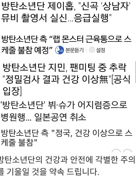 아니 솔직히 이게 한두번이야? 몇년에 한번도 솔직히 이해 안가는데 몇달에 한번꼴로 맨날 똑같은 레퍼토리야. 그때마다 애들이 아픈거까진 빅히트도 어쩔 수 없잖아, 스케줄 조정 해주겠지, 이미 잡힌 스케줄을 어쩔 수 없는거면 아직 안 잡힌 스케줄부터는 제대로 잡겠지, 빅히트 믿고 기다려봐야지, 다음번엔 달라지겠지, 다시는 이런 일 없겠지 하면서 넘어가는것도 한두번이지 진짜. 솔직히 이 정도면 빅히트가 문제 있는거 아니야? 지금까지 빅히트가 냈었던 피드백들을 봐. 항상 애들이 아프다고 건강과 안전을 최우선으로 하겠다고 항상 똑같이 말을 했어. 근데 달라진게 있어? 한두번도 아니고 주의하겠다면서 애들은 계속 아파. 이번 아시아 투어 스케줄도 봐. 아니 솔직히 생각이 있으면 여름 절정기인 7~8월에 아시아 투어 랩시고 동아시아고 뭐고 동남아고 뭐고 보내는게 상식적으로 말이 된다고 생각하냐고. 물론 빅히트도 애들을 죽이려고 스케줄 잡은건 아니겠지만 난 이해 안된다고. 물 들어올때 노를 젓는것도 정도가 있지 솔직히 이 정도면 심각하잖아. 애들도 아무리 어리고 젊다고 해도 그렇게 자주 아픈데 몸이 남아나겠어? 솔직히 난 문제 있다고 보는데 내가 예민한거야?