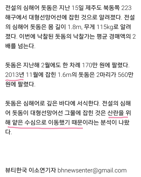 이번이 돗돔이 잡힌 이유는 산란을 위해 수심이 얕은 곳으로 고기가 나와서라고 함.