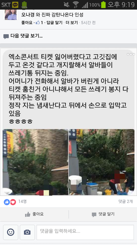 저기서 엑소콘 티켓 찾는다는 증거 1도없고 알바들이 찾아주고 있다고하는데 사진에 여자사진이 나옴 근데 저기 식당에는 막상 여자알바가 없댘ㅋㅋㅋㅋㅋㅋㅋ 시1발 말로하면 쉽지?ㅋㅋㅋㅋㅋㅋㅋㅋㅋㅋㅋㅋㅋㅋㅋ sm이 고소안하니까 존1나 막퍼뜨리네 진짜