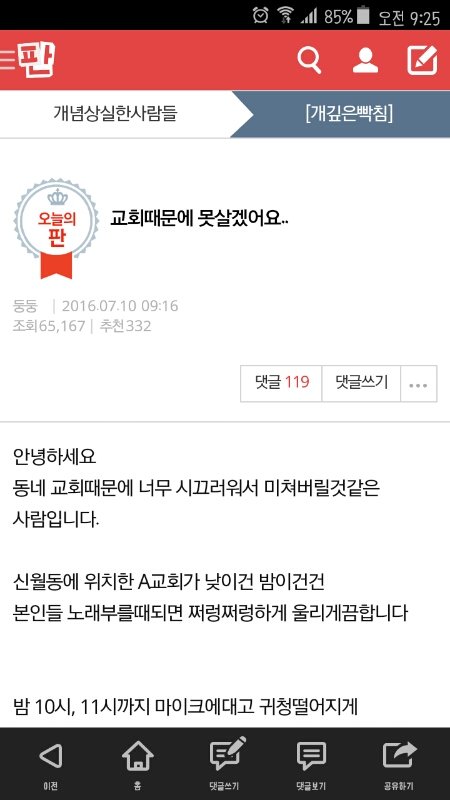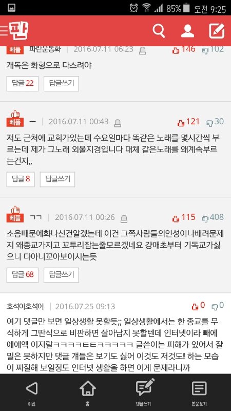 댓글을 적으러 가보니 기독됴에 대한 무수한 욕이 있더라고요. 무차별 적으로 모든 기독교인을 싸잡아서 욕하고 기분이 그리 좋지는 않았어요.